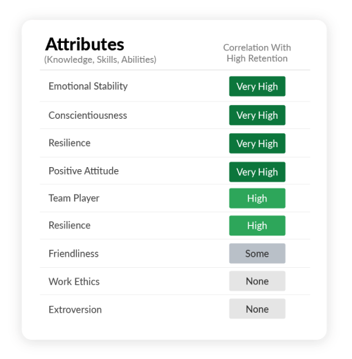 Our system tracks and analyzes the abilities, skills, knowledge, and other attributes that distinguish those who stay in the company from those who leave. This information is used to build a hiring process that screens for the most important attributes when hiring, increasing the likelihood people will stay.